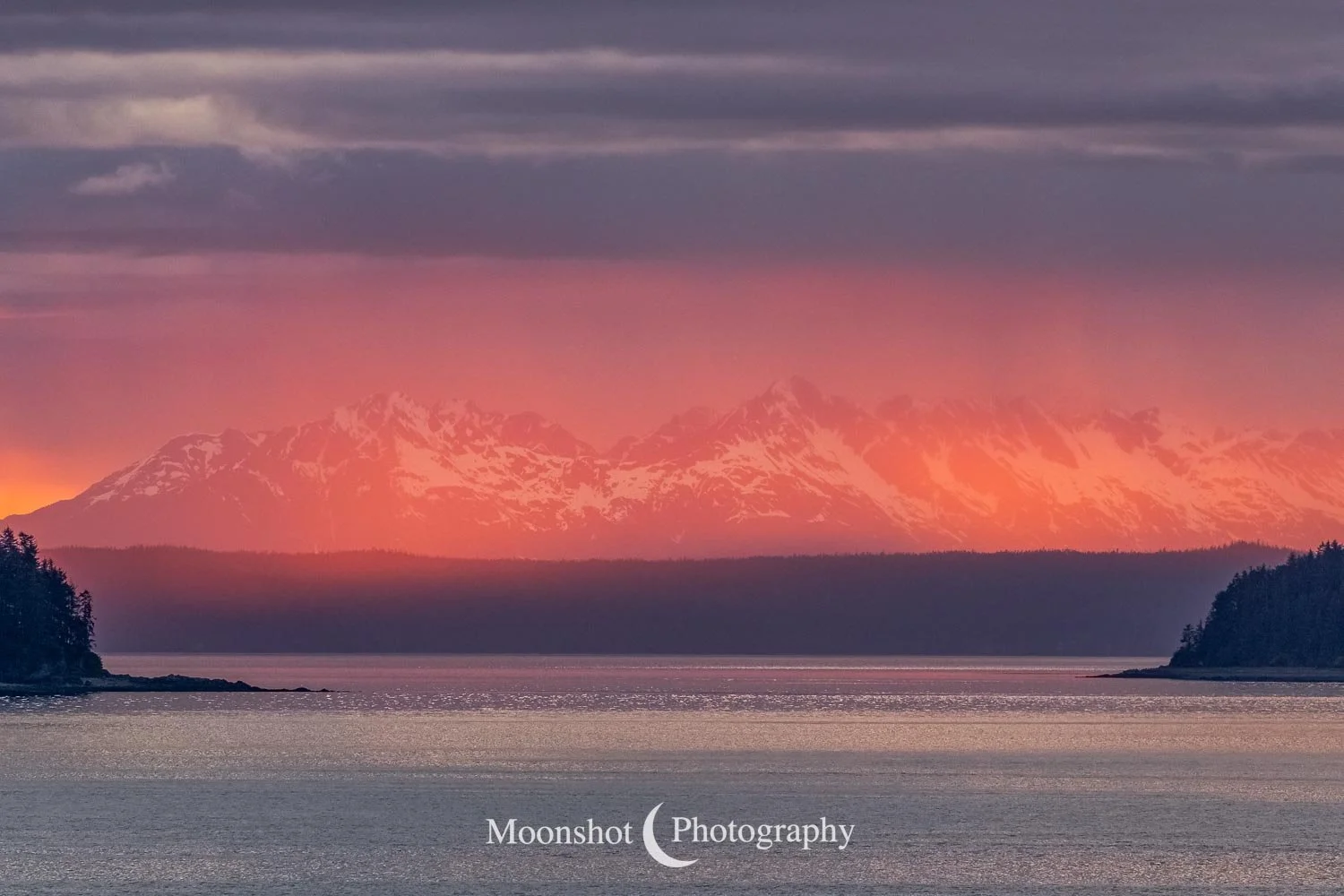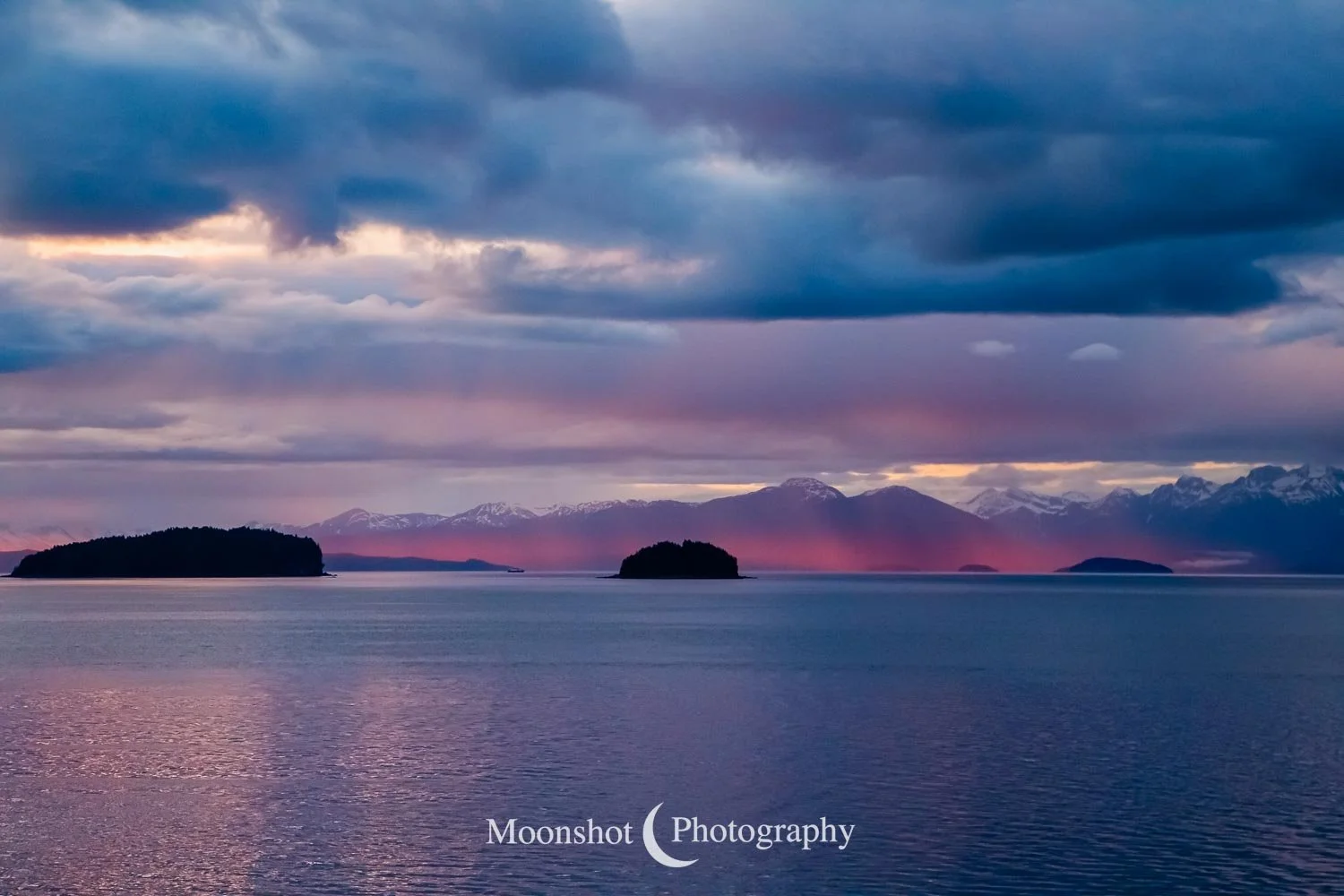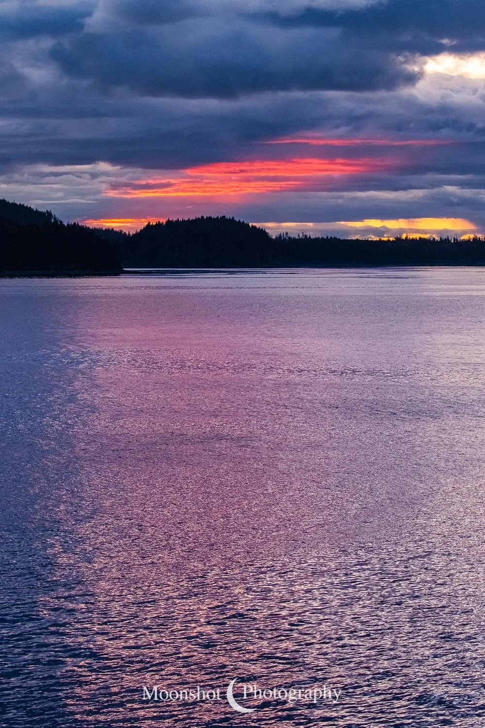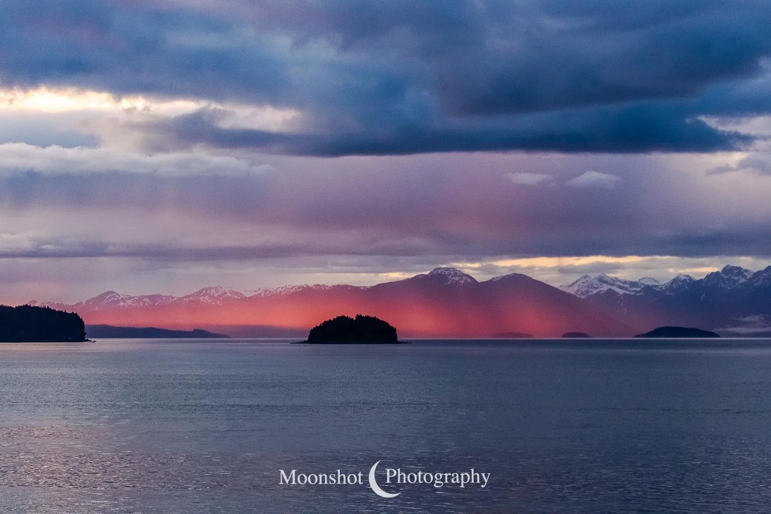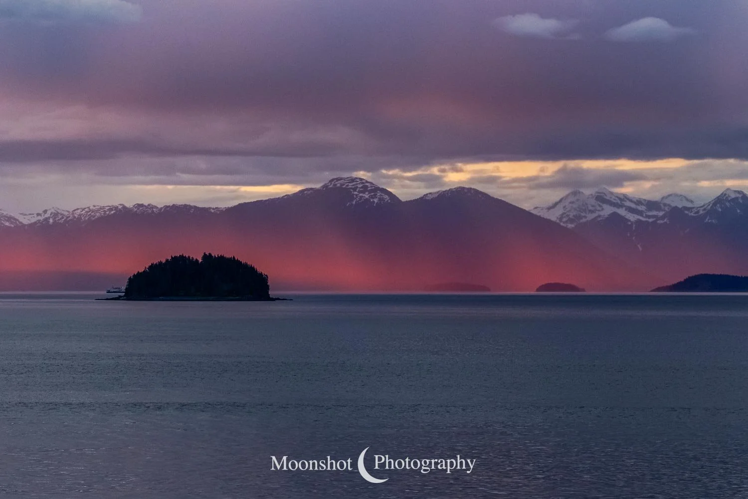 The far northern latitudes mean daylight lasts a long time in the late spring and summer. It also provides for extended periods of dawn and dusk. Put together with the ocean, mountains, and clouds, the sunrises and sunsets can be both unique and spectacular. I had never seen anything quite like the sunset at Icy Strait Point. There was rain to the north between the little islands and the mountains. The clouds to the far west had broken, leaving a sliver of clear horizon. As the sun descended to this point, I had expected the rain and canopy of clouds to be illuminated in gold, but instead, only the rain at the surface was set alight… in pink!