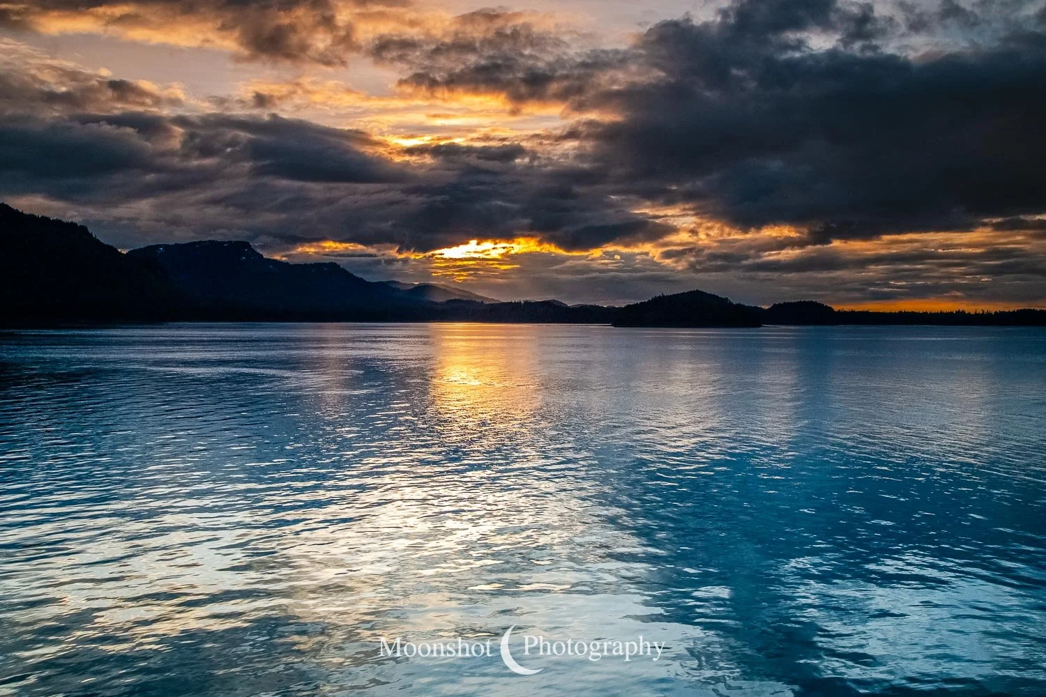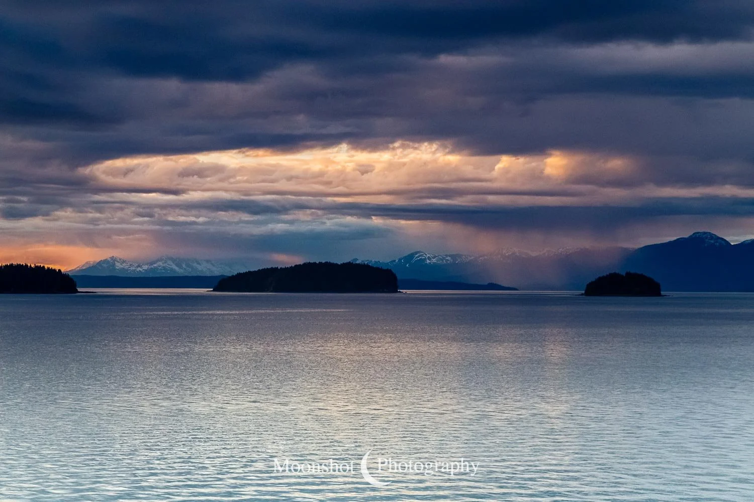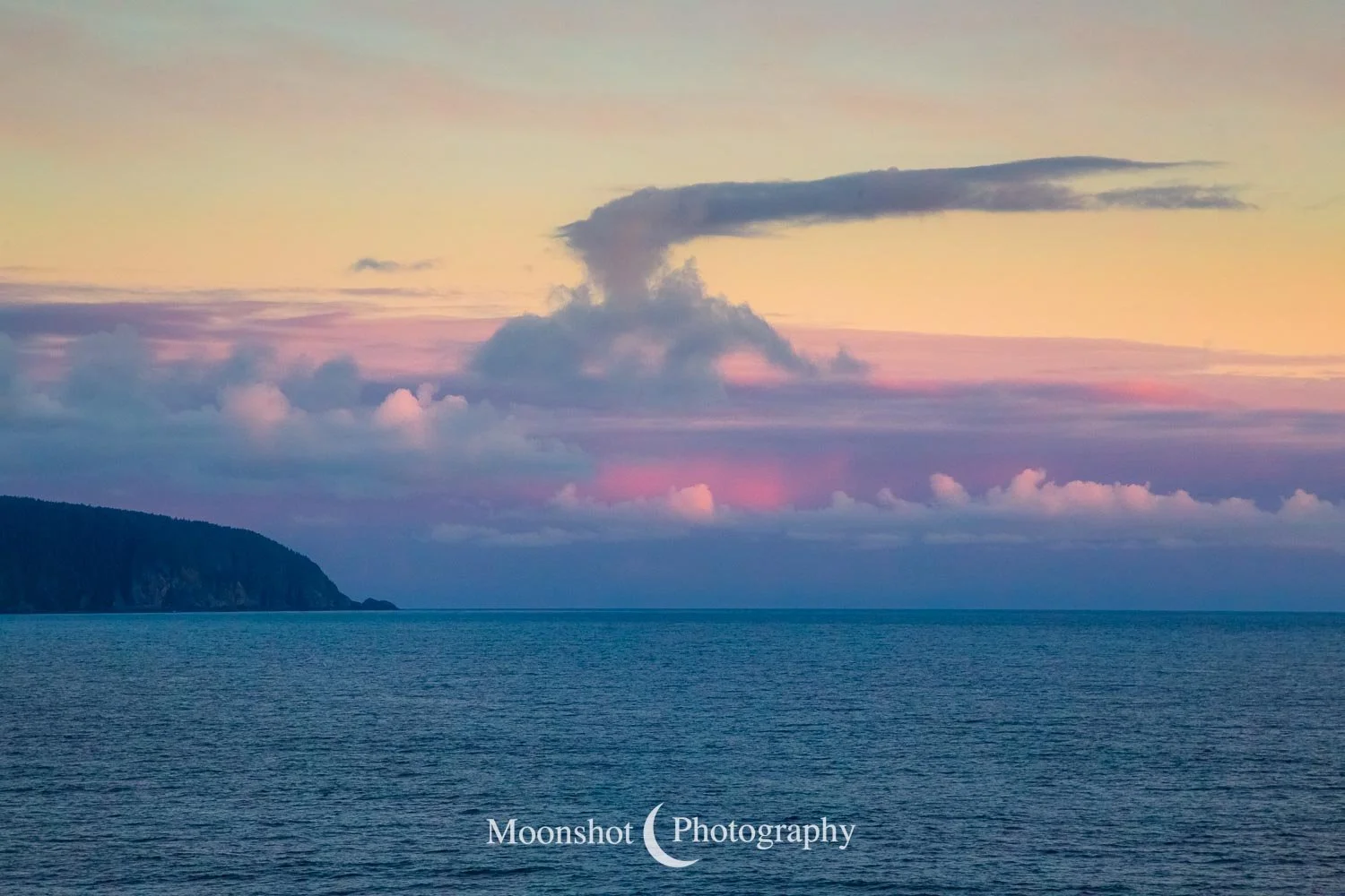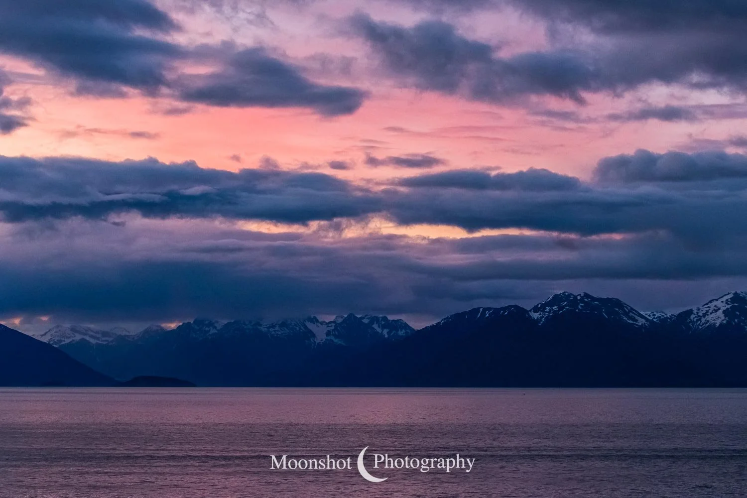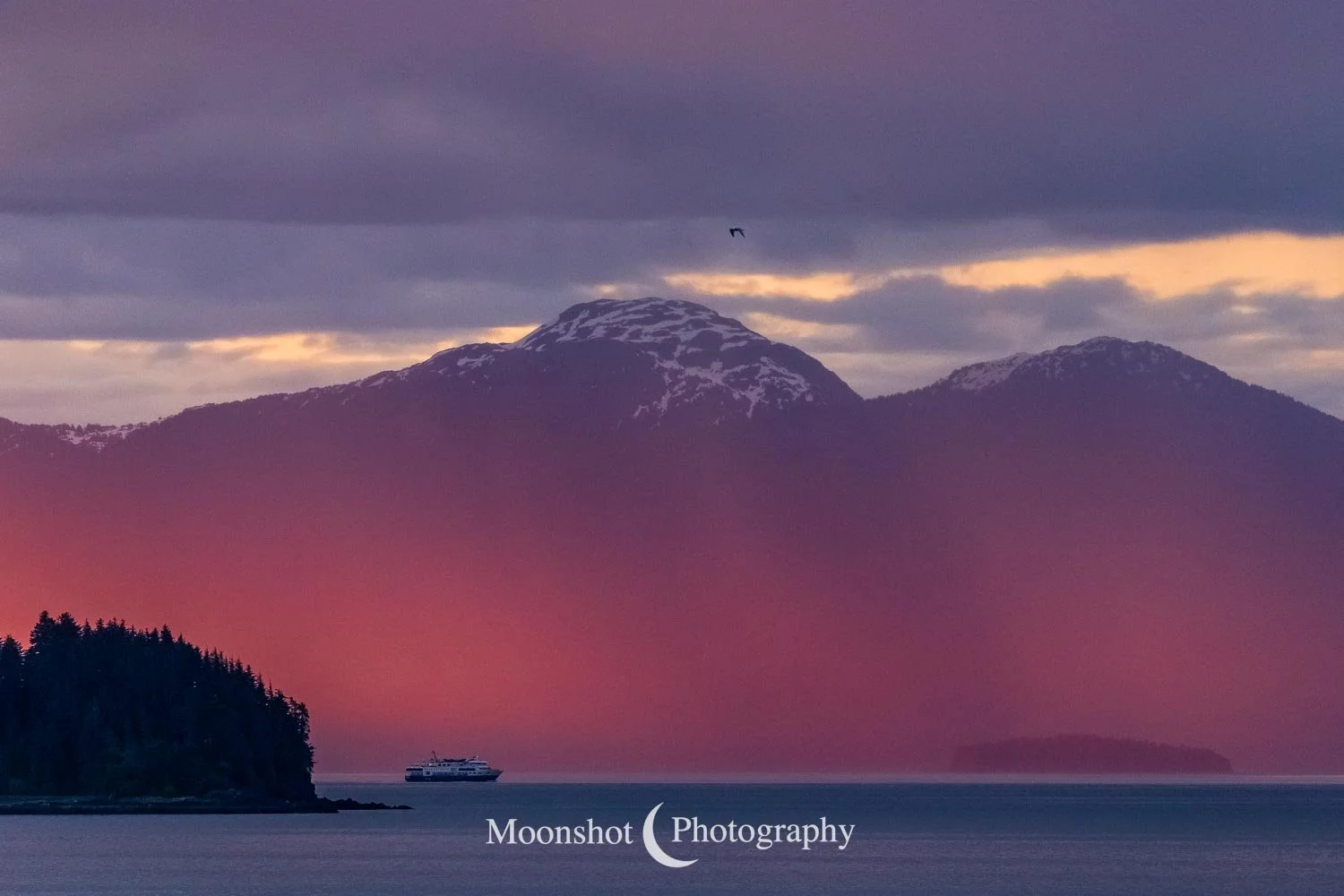 The far northern latitudes mean daylight lasts a long time in the late spring and summer. It also provides for extended periods of dawn and dusk. Put together with the ocean, mountains, and clouds, the sunrises and sunsets can be both unique and spectacular. I had never seen anything quite like the sunset at Icy Strait Point. There was rain to the north between the little islands and the mountains. The clouds to the far west had broken, leaving a sliver of clear horizon. As the sun descended to this point, I had expected the rain and canopy of clouds to be illuminated in gold, but instead, only the rain at the surface was set alight… in pink!