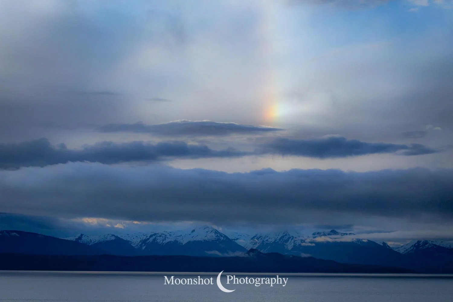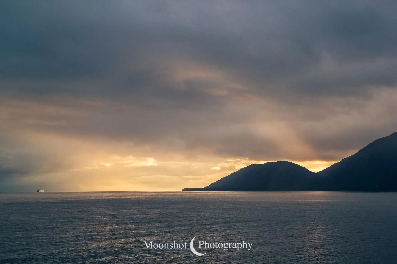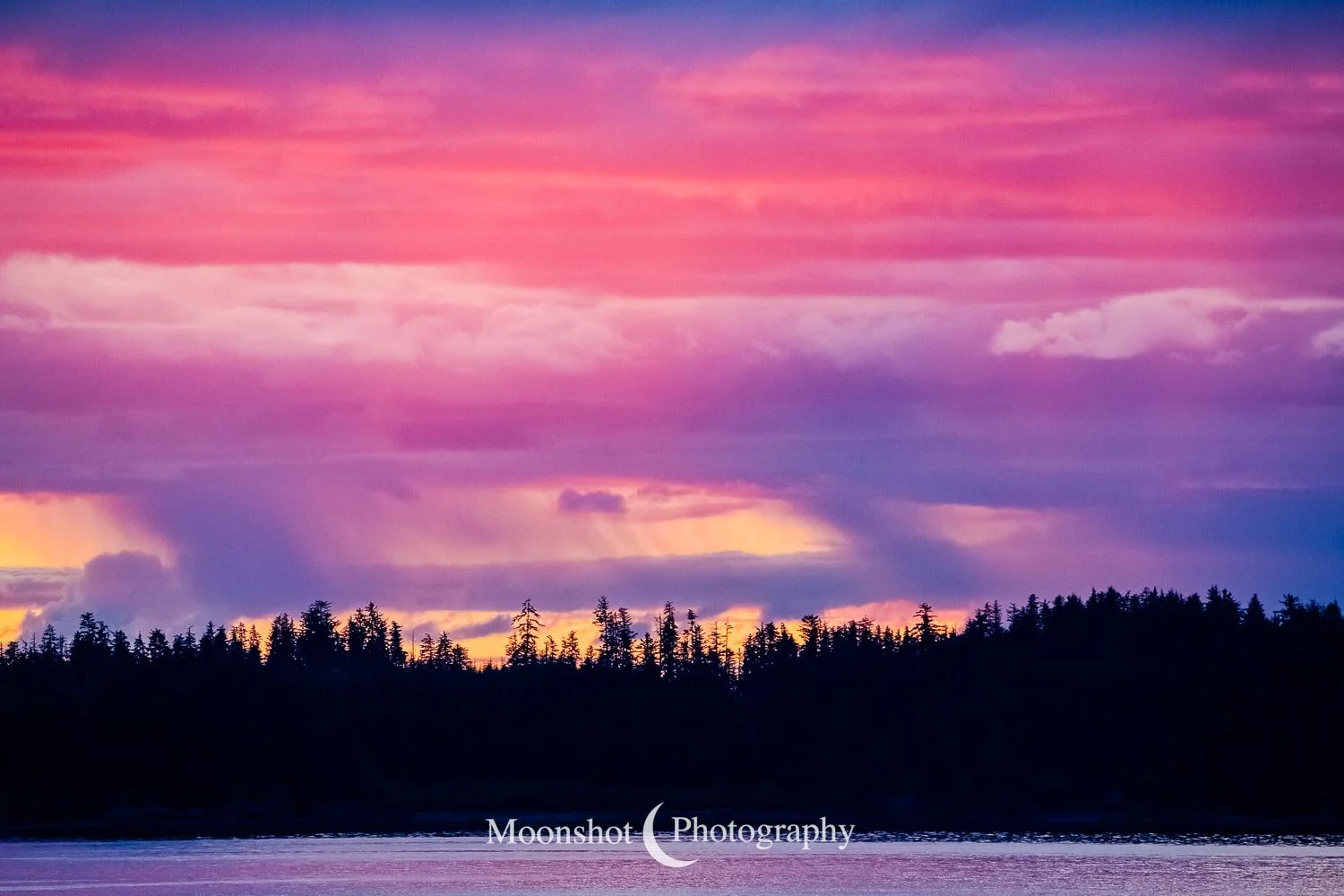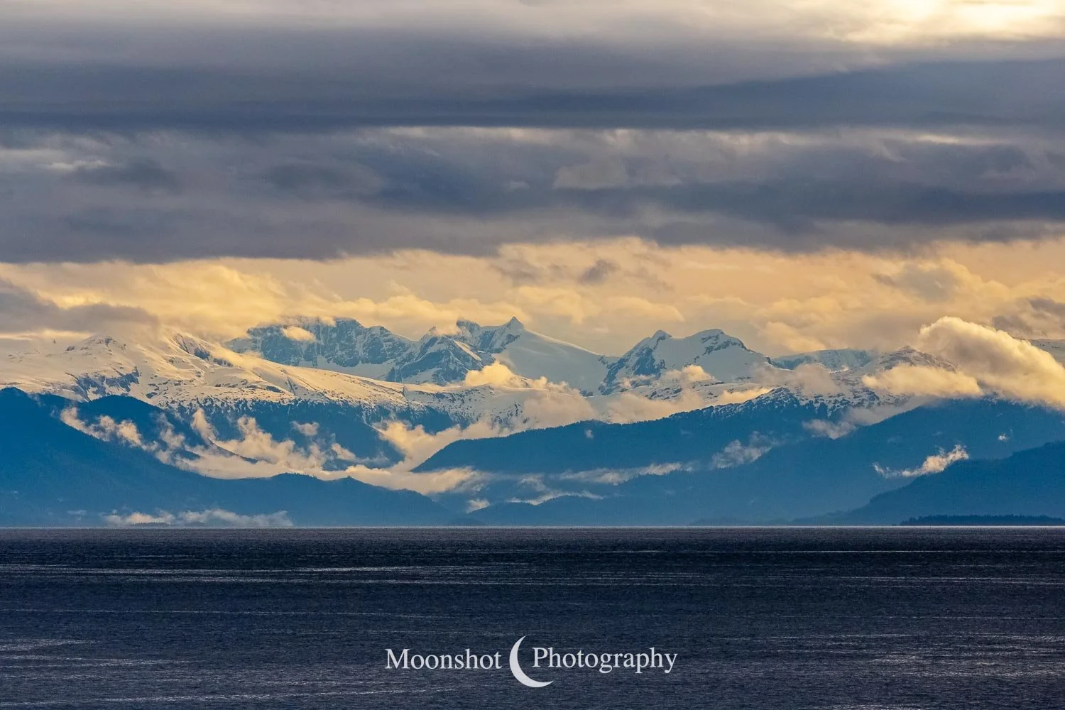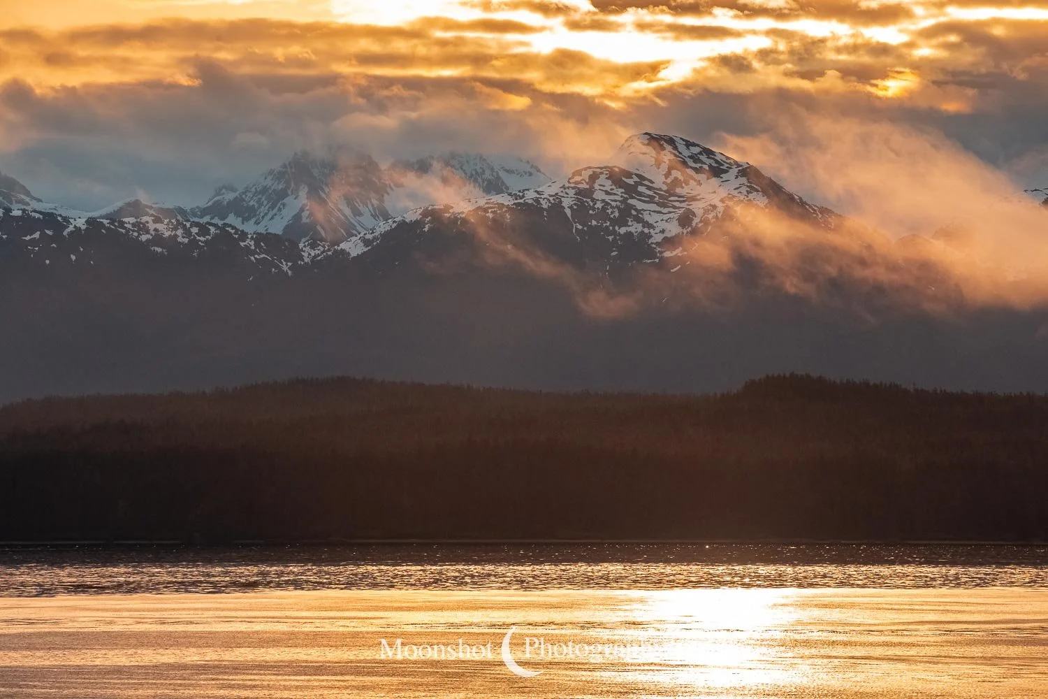 The far northern latitudes mean daylight lasts a long time in the late spring and summer. It also provides for extended periods of dawn and dusk. Put together with the ocean, mountains, and clouds, the sunrises and sunsets can be both unique and spectacular. I had never seen anything quite like the sunset at Icy Strait Point. There was rain to the north between the little islands and the mountains. The clouds to the far west had broken, leaving a sliver of clear horizon. As the sun descended to this point, I had expected the rain and canopy of clouds to be illuminated in gold, but instead, only the rain at the surface was set alight… in pink!