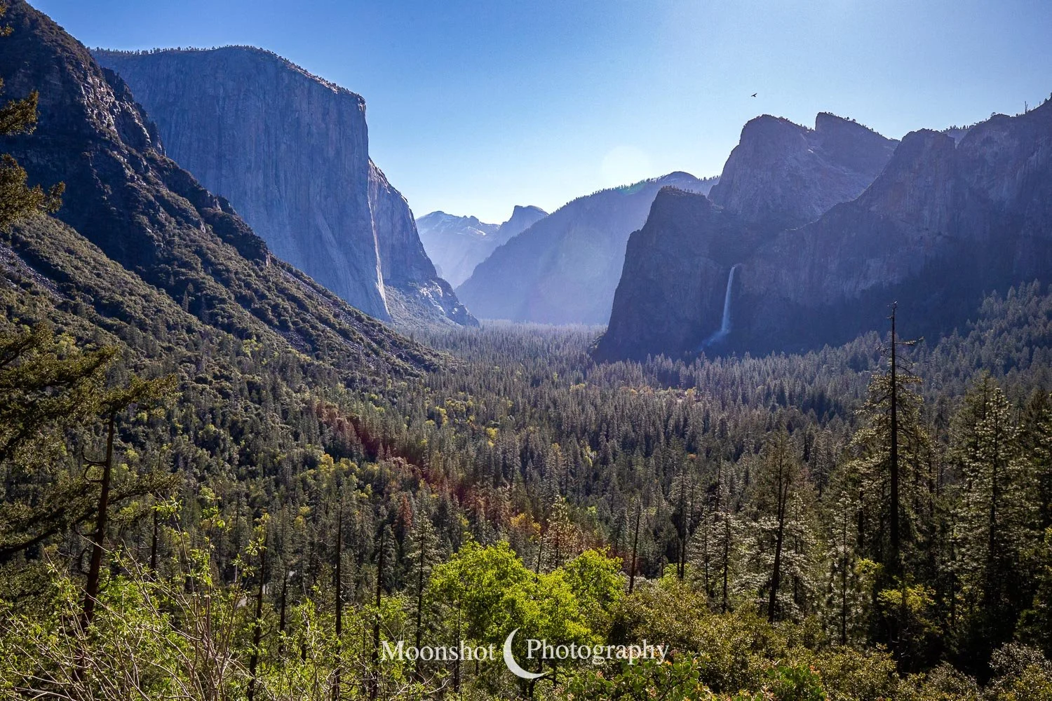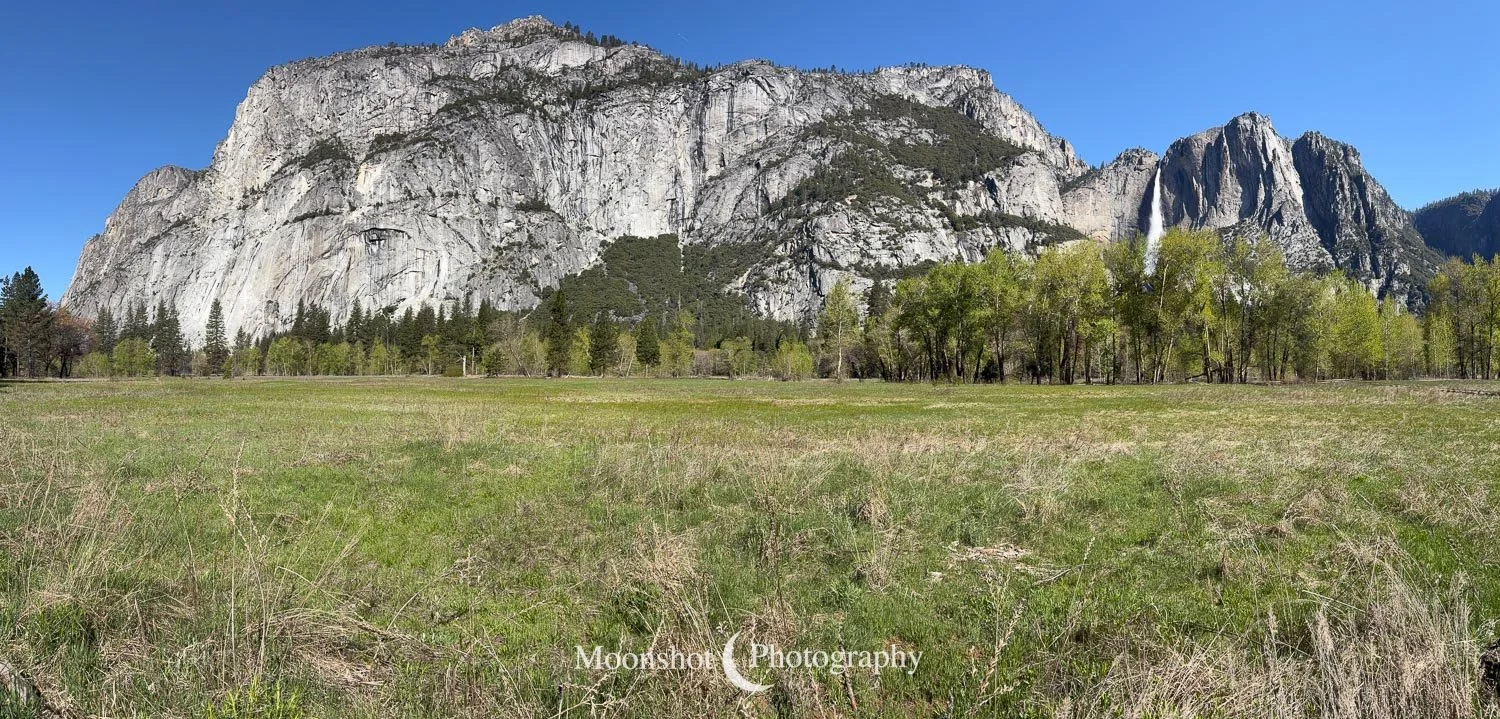 Panoramic view within Yosemite Valley, including Yosemite Falls.