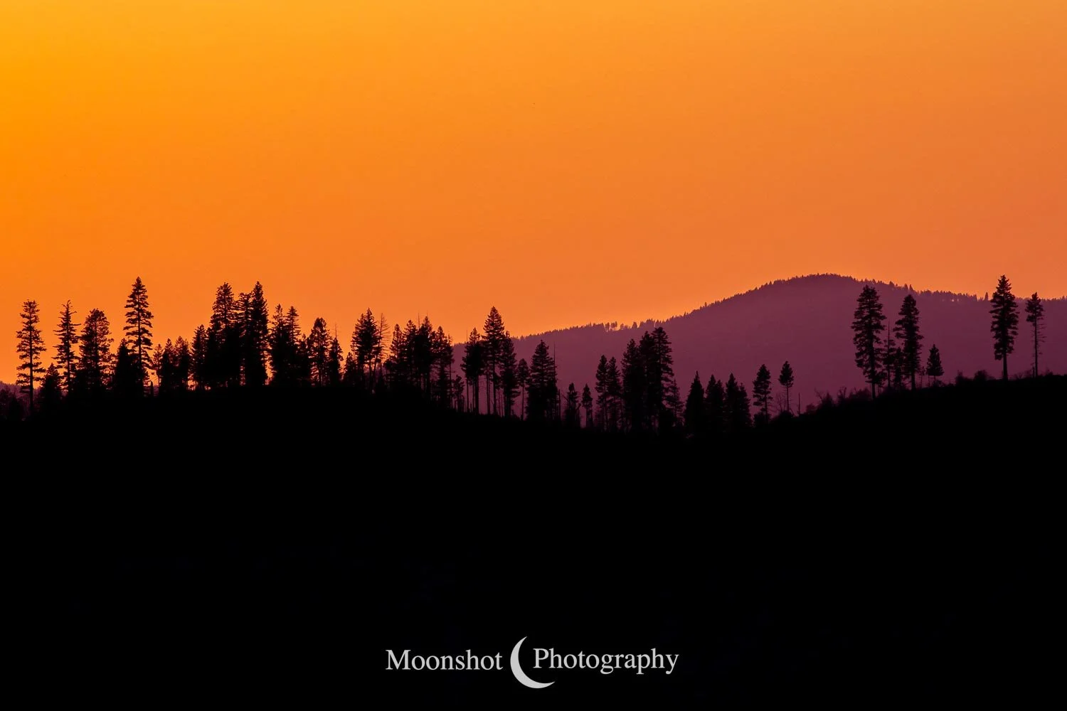 Sunset in the Sierras silhouetteβs the evergreens along a ridge.